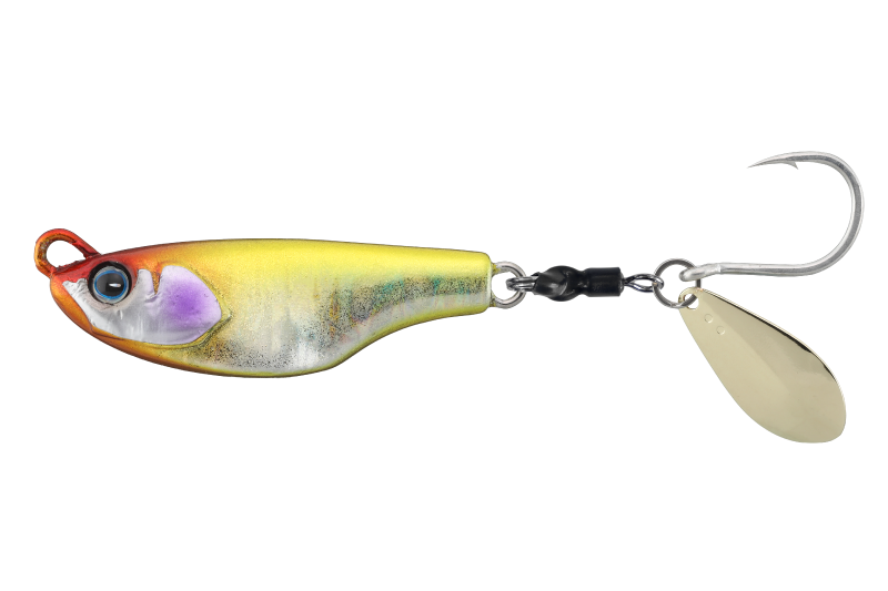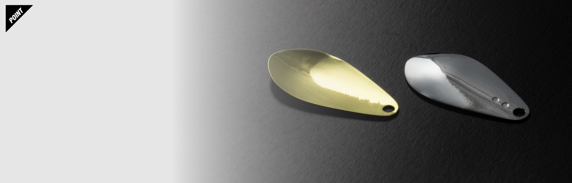 形状とサイズ、曲がり具合の微調整を重ねたブレードは、ウィロー型とコロラド型の中間のような形状。このジャンルの釣りでよく使用されるコロラド型に比べてシャープな前端が、水の抵抗と空気抵抗を適度に逃がし、心地よい引き抵抗と操作感、そして抜群の飛距離に貢献。また、後端部でしっかりと水をかき回しつつ、チカチカとしたフラッシングでアピールします。