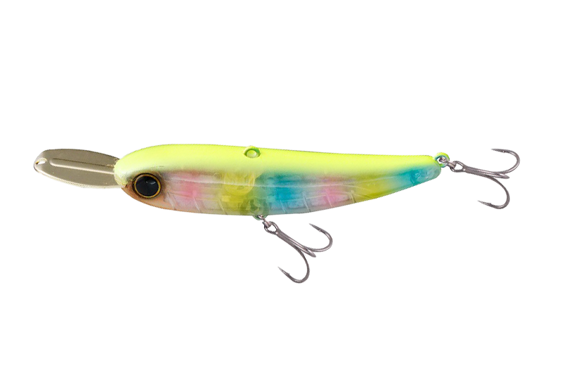 80mmボディでウェイトは21.7g。同サイズのフローティングペンシルと比べても圧倒的な飛距離を実現。巻くだけで発生する水面でのパニックアクションは、非常に高いアピール力で広範囲にアピールします。