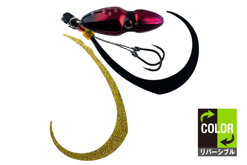 ヘッド、スカート、ネクタイが一連の従来の漁具型ルアーと異なり、ボディとネクタイ+フックを別パーツとして構成。さらに並列にセットしボリューム感を抑えたことでコンパクト化を実現。ボディへのバイトもフッキングに持ち込みます。