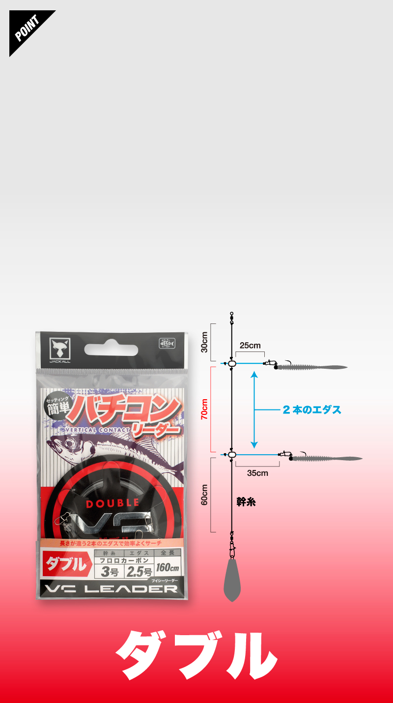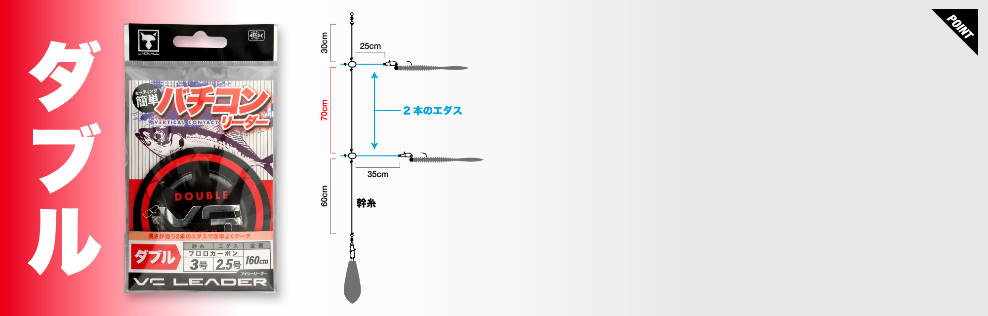 1投で2種類のワーム形状やカラーを試す事ができるうえ、エダスの長さを上下で10cm変えることで異なるアクションが同時に演出可能。その日の状況に最適なアプローチ方法を効率的に見極めることができる設計です。また、エダス同士の間隔を広く設定しているため、一度により広い範囲を探ることができ、アジが潜むレンジ(水深)を素早く探ることができます。