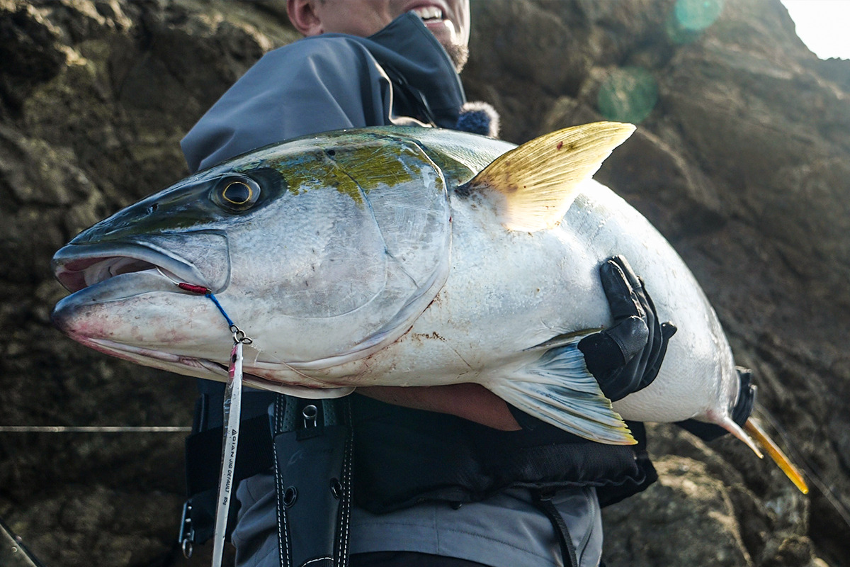 明らかに巨大なヒラマサだと分かるそのパワーにドラグも引き出されます。しっかりとCiAN 99XHに体重を乗せて曲げこみ魚にプレッシャーを与えながら、巻ける時はショートポンピングで素早く巻き取ります。しかし、足元まで魚が近づいた時に大きな難関が待っていました。「瀬擦れ」です。大きく張り出した足元のハングに思いっきり走っていくヒラマサ、そしてPE4号・リーダー70LBが瀬に思いっきり擦れ始めました。こうなるとキャッチできるかはかなり難しい状況です。大型ヒラマサと対峙するのは4号PEラインというのは決して安心できる強度はありません。こんな状況で大事なのは「慌てず、ラインを一点で擦れさせない」事です。ラインの特性上、一点で擦れてしまうと一瞬で切れますがドラグを使って広範囲に擦れさせれば案外持ってくれます。その様に慎重に粘っていると瀬に噛んでいたラインが外れて魚が沖に離れた。99XHを思いっきり曲げこんで一気に浮かせにかかる!そして見えてきたのは巨大なヒラマサの姿。明らかに10kgは軽く超えている魚体に慌てながらもなんとかランディング。