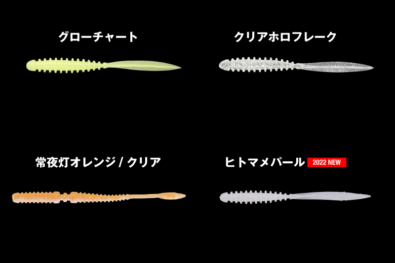 ボリュームのあるペケリング、浅リブで柔らかく流れに逆らいにくいタイドMAX、そして今年発売予定の微波動系ストレートワーム。