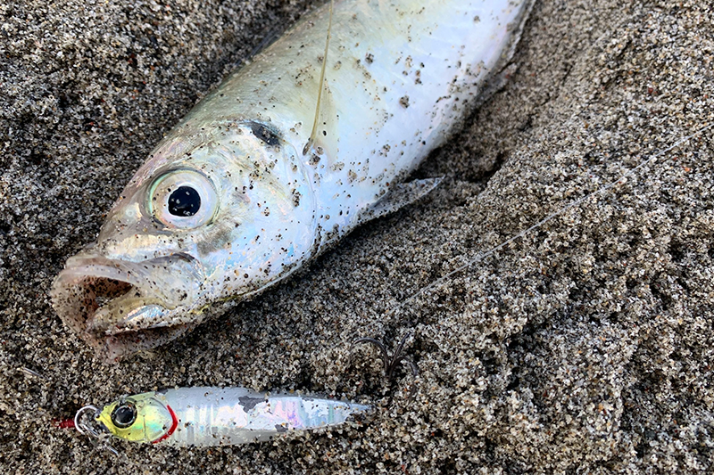 普段はただ巻きやリフトアンドフォールで誘いますが、ハクなどのマイクロベイトパターンの時は、ハクは波打ち際ギリギリを回遊していることが多いため、移動距離を抑えたリフトアンドフォールでハクを散らすように探ります。またマイクロベイトパターンにはワグシャッドのようなテールが小さいシャッドテールなどが有効です。