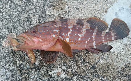 ショア沿いのキジハタは明るいうちはテトラの中や沈み根などに身をひそめ、