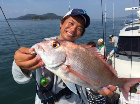 しまなみ海道ならではの、早い潮流と複雑な地形変化に悩まされましたが、ボトム感知はもちろん、操作性の良いベイトテンヤスペシャルのおかげで良型のマダイをキャッチ!