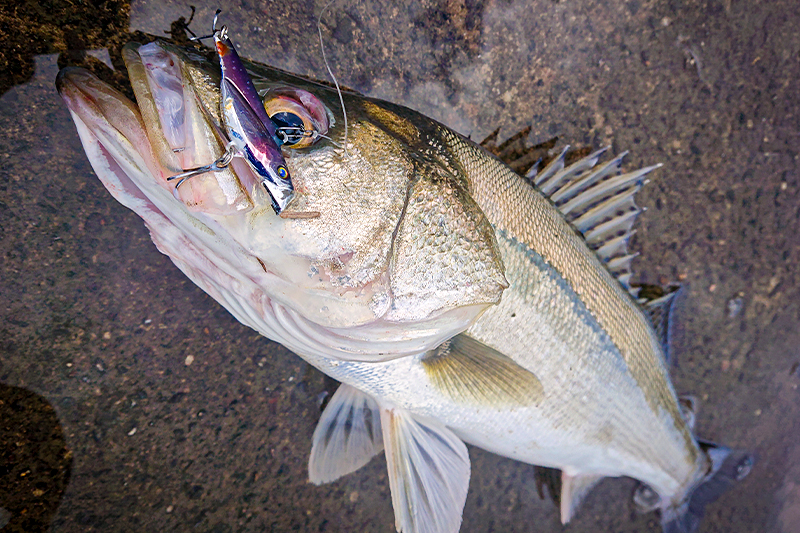沖に遠投しロッドポジションを下げ、ボトムにタッチするかしないかのレンジをミディアムリトリーブで広範囲に探ると回収間際の浮上アクションでひったくるようなバイト。