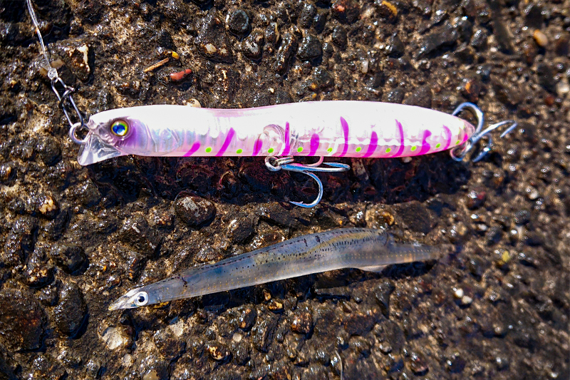 シラウオイミテートならば表層をゆっくりと引けるハグレ・ヒエイなどのアイテムが有効だと思いますが当日のコンディションは強い波で表層系のルアーが使い物にならない程でした。
