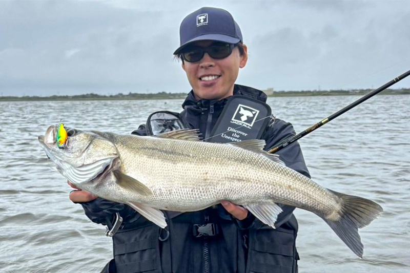 シャローフラットのギリギリまで立ちこみ、ブレイクラインでベイトを待ち構えているシーバスをバイブレーションで狙います。