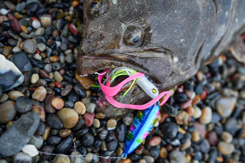 出し風と遠投性能のおかげでベイトのいる場所まで届いたところで、ボトムに着底させてからスローリトリーブで巻いていき、テンションフォールさせてラバーとネクタイのヒラヒラ感をじっくり見せたタイミングでバイト!!