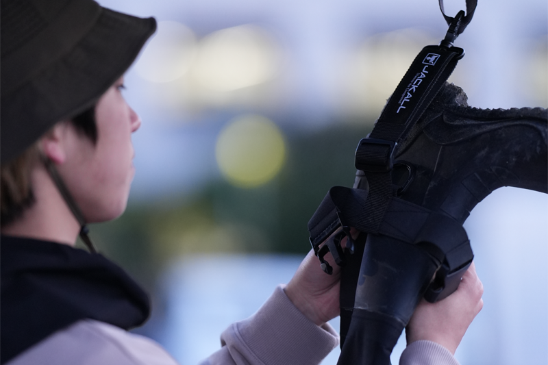 ・先端のナスカンを中央のD管に回し掛けていただくことで物干しなどに取り付けて下さい。 ・ブーツやウェーダーを片足ずつ左右のバックルでしっかりと固定して下さい。