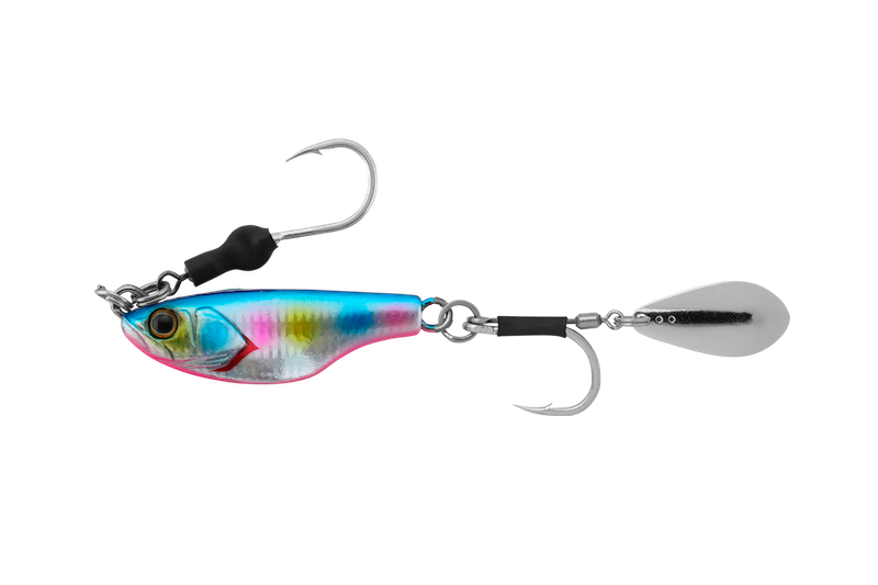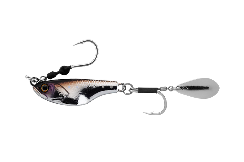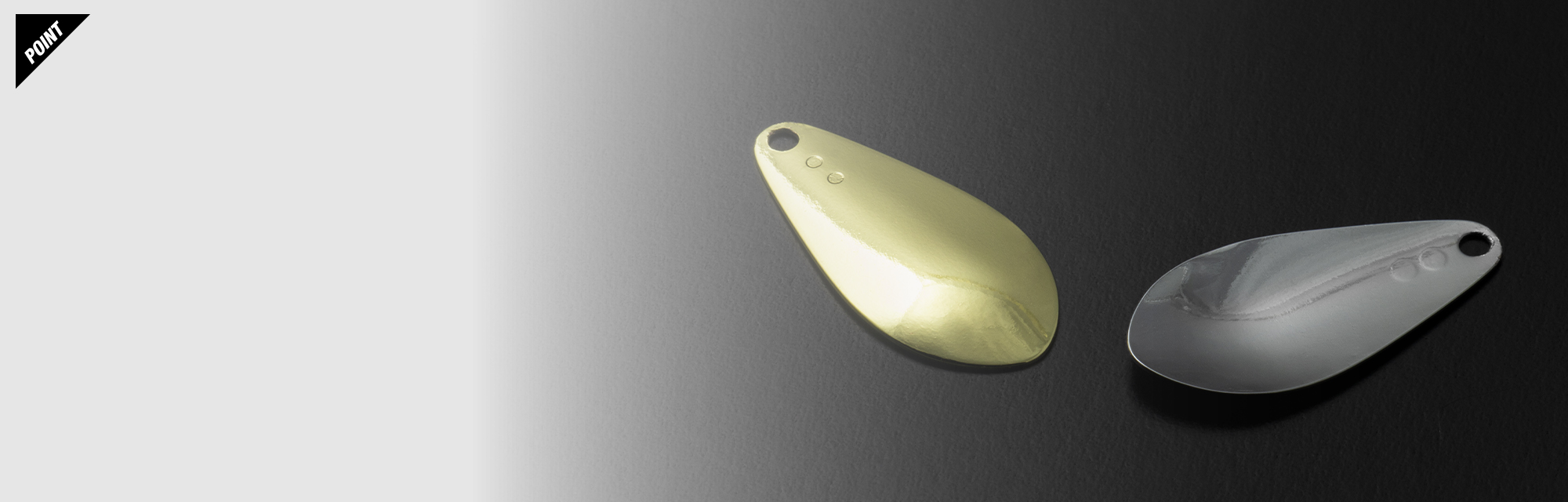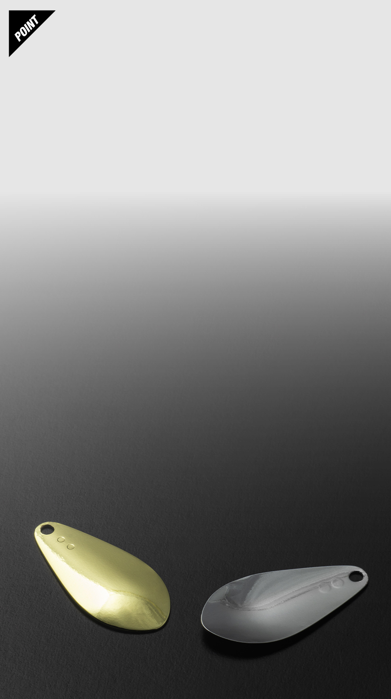 縦、横ともに厚みを持たせたボディ形状によりコンパクトシルエットを実現。ルアーのサイズにシビアで攻略が難しいとされるマイクロベイトパターンに威力を発揮します。また、小型のブレードを採用することで、マイクロベイトのチカチカとした細かいフラッシングを再現しました。