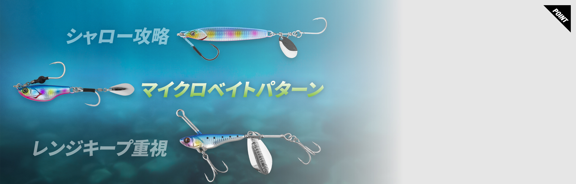 高いレンジキープ性能で、一定の層をじっくり引ける“スピン”。浮き上がりが良く、中~表層やサーフを中心に多魚種を狙える“ラッシュブレード”。そして“バイトビーンズ”は、抜群の飛距離と直進性能で広範囲をテンポよく探り、青物を中心に様々な魚種を狙うことが出来ます。