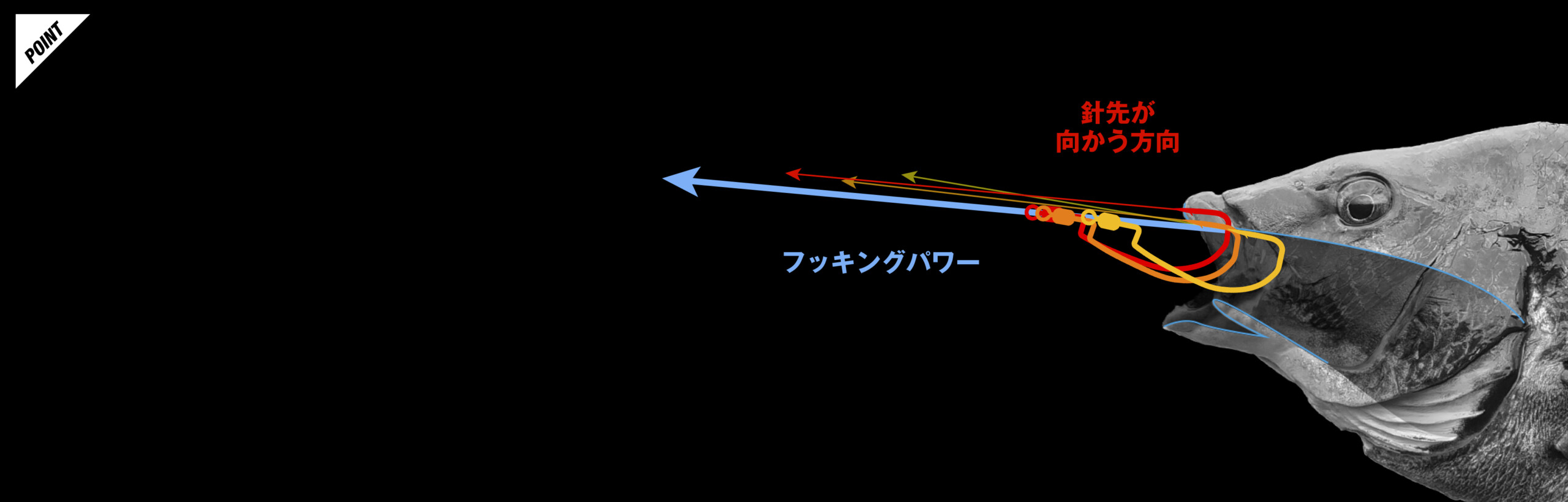 ワームに針先が刺さり込まない範囲でアプローチアングルを小さい角度で設計し、フッキングパワーのロスが少ない刺さり込みを実現します。