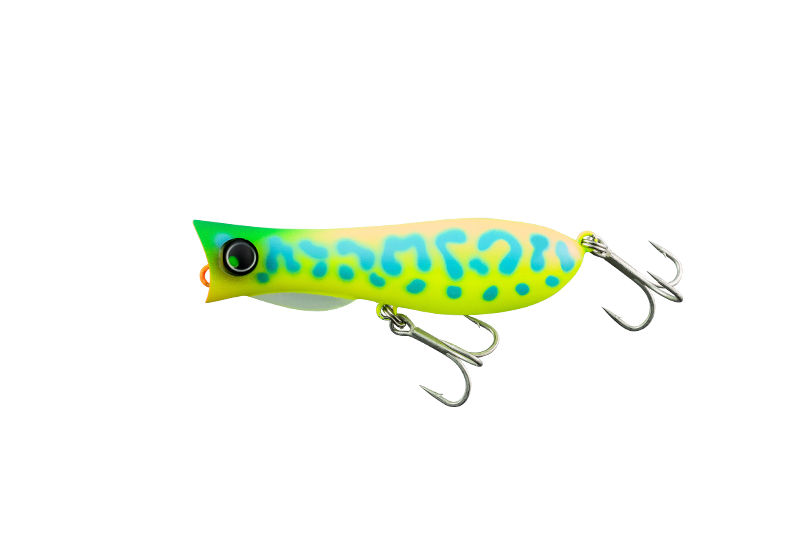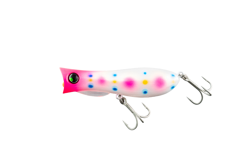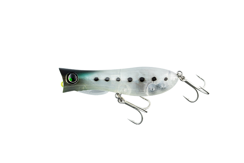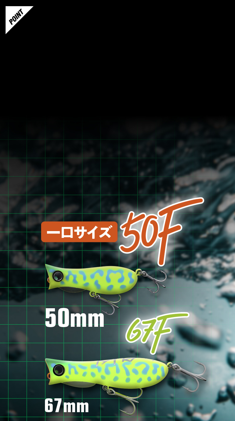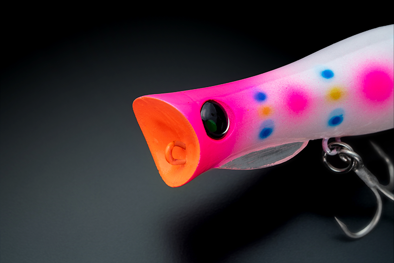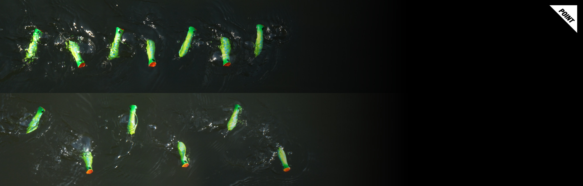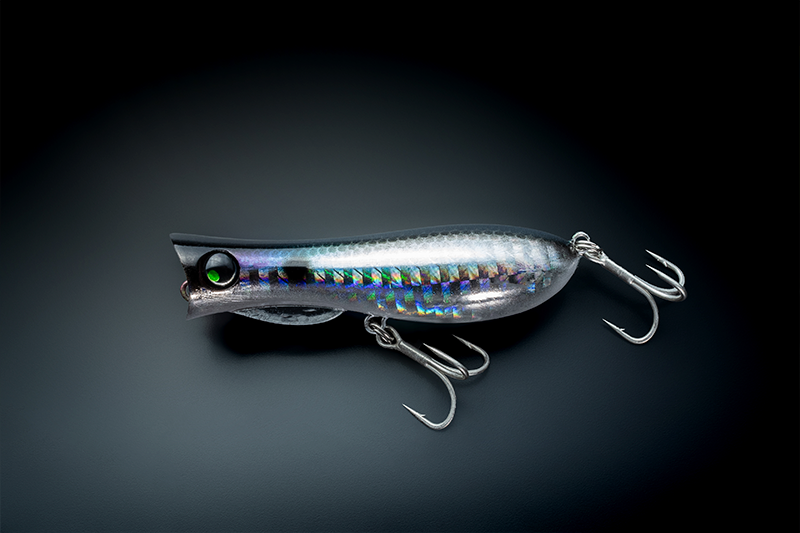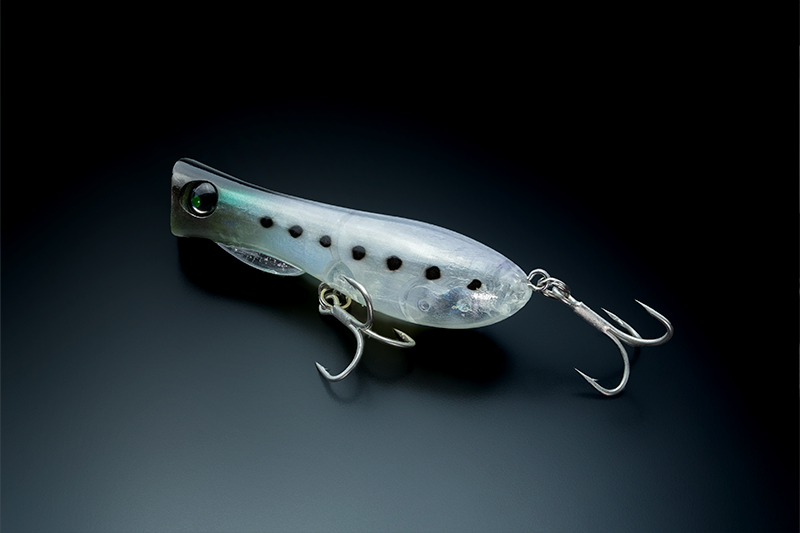 ドッグウォークの際のラインテンションや入力の強さを調整することで、スライド幅を出したテンポのいい広範囲のサーチから、スライド幅を抑え、一点でのねちねちと首を振らせる誘いまで対応。ポッピングはエラーやトラブルが非常に少なく、ポコンッという甘いポップ音で広範囲の魚に呼び掛け、ラフウォーターの状況下における効率的なアピールを担います。