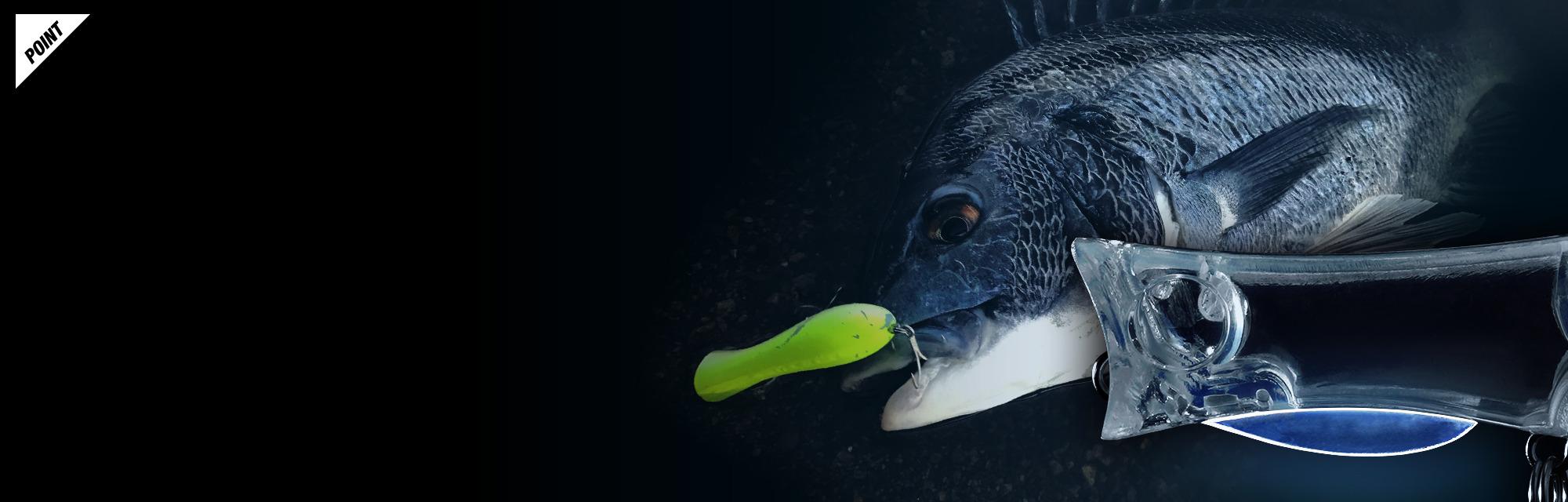 一見おもちゃのような形状のボディはテール部を太くすることでウエイトを乗せ、風を整流することで飛距離を飛躍的にアップ。また、クロダイの傾向として、スライドしすぎるアクションに対してはミスバイトが多いため、太いテールがブレーキをかけ、必要最低限のスライド幅にすることでフッキング率を高めています。