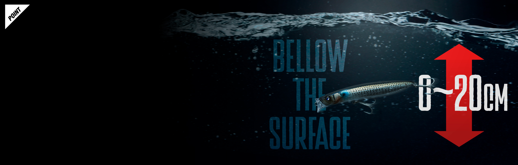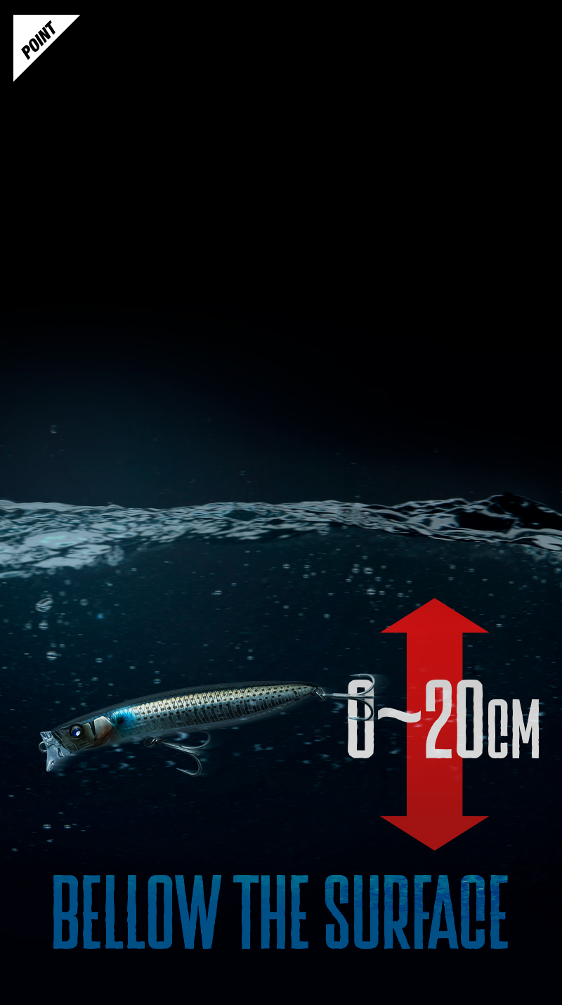 シーバスがベイトを追い込み、最も捕食しやすい0~20cmのレンジに設定。レンジが入りすぎるミノーやトップには出切らないようなセレクティブな状況にも威力を発揮します。流れの速さや巻き速度に関わらずこのレンジをキープし続け、流れの中でのドリフトをはじめ、河口・干潟でのウェーディングやシャロ―エリア・藻場など、あらゆるフィールドに対応します。
