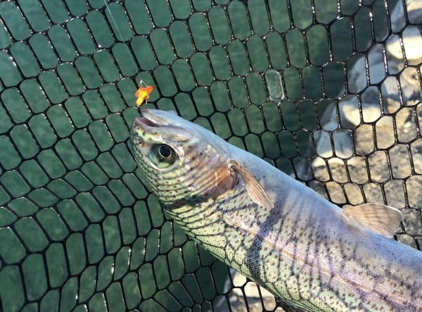 その後、魚のチェイスと群れの移動が少なくなってきた辺りで、ティアロ1.6gにチェンジし、沖の動かない魚と手前にクルーズしてくる放流魚を狙っていきました。