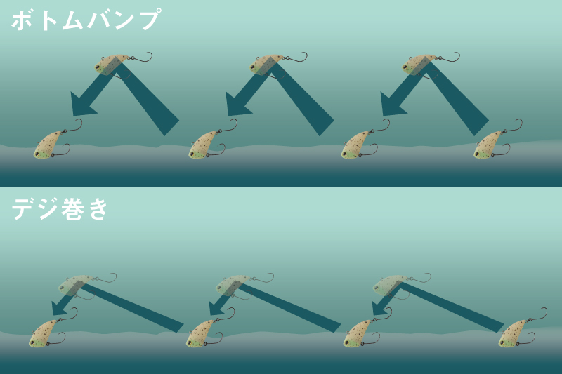この時、デジ巻きのアクションは、1cm程度ルアーの頭が上がるイメージです。