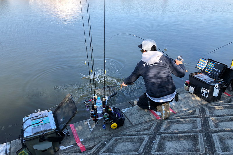 実際当日になってみると、前日にかなりの風が吹いたことから、1週間の内でも一気に気温が下がったタイミングでのスタートでした。そのためプラクティスの時よりも活性は下がっているだろうと予測。魚は朝のうちはボトム付近にいるだろうと思い、魚が浮き始めたタイミングが勝負の分かれ目であると心がけ、そのタイミングを逃さないよう意識して試合に臨みました。