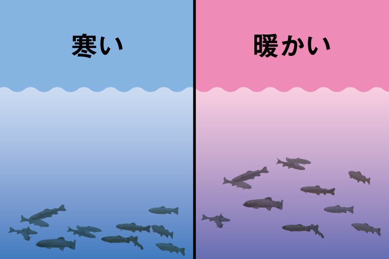 まず、ここ最近の東山湖の状況は気温・水温共に上がり始め、魚の活性が上がってきます。これに伴い、魚も中層〜低層に散らばり始める時期となり、僕が得意としているティアロの巻きは少し厳しくなってくる季節でもあります。
