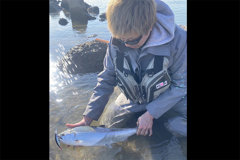 時刻は16時を過ぎてしまい、今日最後と決めたポイントへ。流れが絞られ手前にテトラの入っているポイントでした。ダウンクロスでトリコロールGT88MDのパールアユをスローに時折トゥイッチを入れながら流していくと、数投目に「ズドン!」と今年1本目のサクラマスがヒット。今年から私の相棒は「Tコネクションストリーム80M」となっているのですが、魚が掛かってから驚きました。