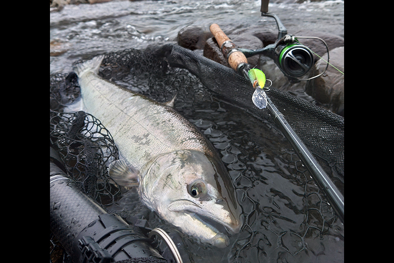 4月29日土曜日、この日も朝から川辺に立つが何もなく野暮用のために10時に一度上がりました。お昼ご飯を食べネットで天気予報を確認すると夕方に一気に気圧が下がり小雨が降る予報になっていたので、そのタイミングをめがけて再度川辺に立つことにしました。ロッドはTコネクションストリーム86 M+、ルアーはTricoroll GT 72 DR-F、カラーはパラレルチャート、今現在一番自信が持てるセッティングでキャストを開始。そして、その時は来ました。ルアーを引っ手繰る様な強烈なアタリで幕が開き真剣勝負を開始です。ルアーの掛かりどころを確認すると抜群の状況であり、私がミスをしなければ確実に取れると判断しました。一度ネットに入れたサクラマスが暴れて出たときは、やってはいけない致命的なミスを犯したかと思いましたが何とか無事で最後には何とかランディングに成功いたしました。