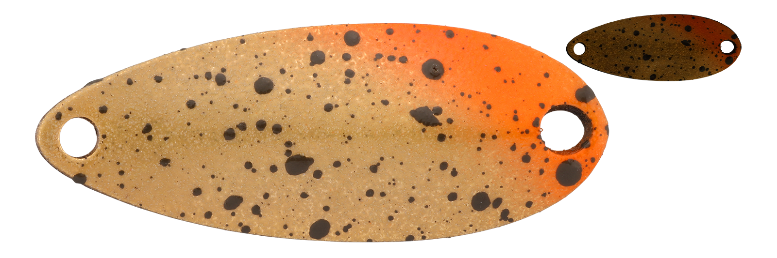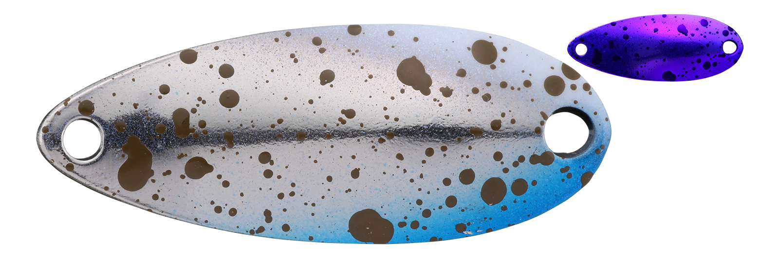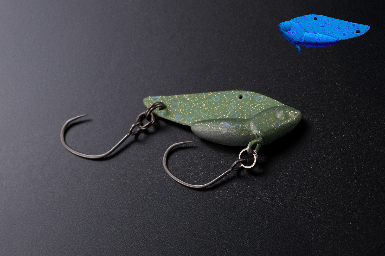 クリアグリーンをベースに金粉+ブルーパールを使用し、ナチュラルさを残しつつ様々な活性のトラウトにアジャストできるカラーに仕上げました。ギミックにUV(ケイムラ)塗料を使用して水質・時間帯問わず使っていただけるスペシャルカラーとなっています。