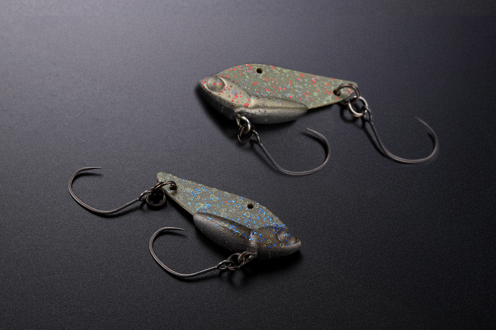 リフト&フォール時の移動距離を抑え、長時間魚にアピール可能。標準2フック仕様ながら、フックハンガーやスプリットリング配置を工夫し、フック絡みを軽減しています。0.6mm基盤材による高い強度と明確な振動感に加え、着底後にワンテンポ遅れて倒れ込む独自アクションで、リアクションバイトを効果的に誘発します。