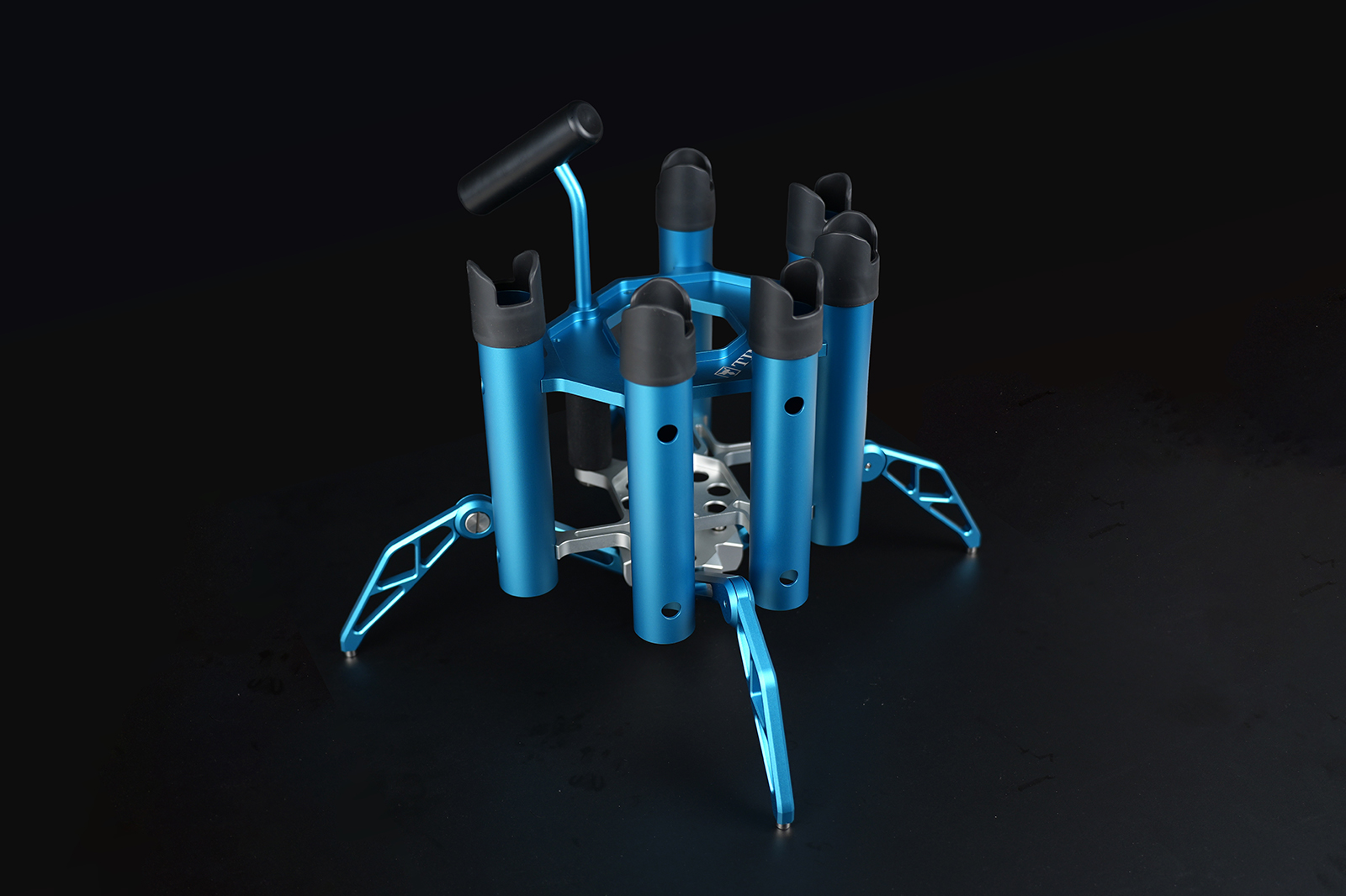 低重心の4レッグ構造により、不安定な足場でも倒れにくく、脚の開き角度調整で設置性も向上。ABSマシンカットハンドルノブは寒冷時でも握りやすく、持ち運び時のバランスにも配慮しています。さらに2種類のルアーキーパーやペットボトルホルダーを備え、実釣時の快適性と機動力を高めた実用性の高いスタンドです。