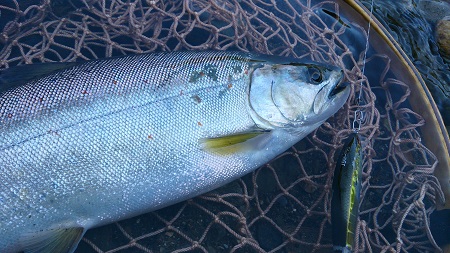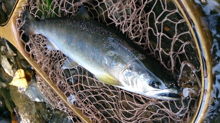 サイズは31cmでしたがネットに収まってから良く見ると雄アマゴでした。