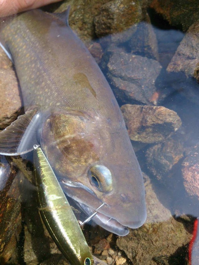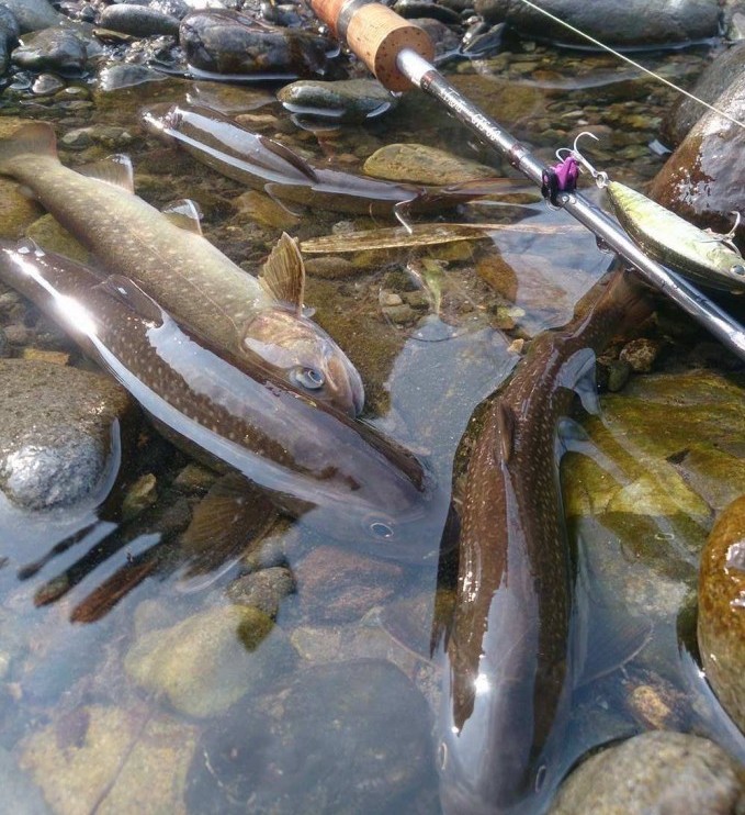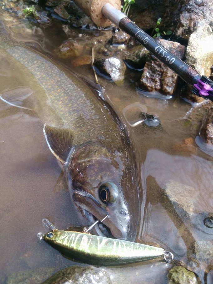 四月も間近となりましたが この地方は水温も低く魚のスイッチも入りにくいと考え遠距離からのダウンクロスでのアプローチで試みてみました。若干の深みのある流芯脇に魚が着いていると思い 重点的にトゥィッチを入れて探っていると岩魚特有の重量感のあるバイト!久しぶりの感触を楽しみながらのファイトでネットインしたのはこの時期には珍しい尺岩魚がキャッチ出来ました。