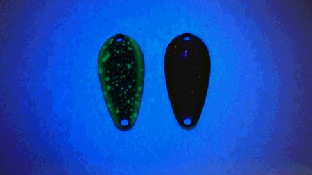 この蛍光色とグローはブラックライトを当てるとこのように光ります。