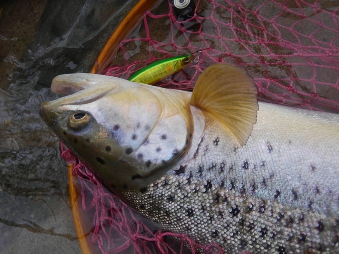 引きずり出してくれたルアーはトリコロールGT72MDF、グリーゴールドアユ。