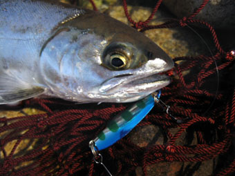 およそ40分ほど掛けて長い瀬を下りていった。 ぜんぜんいまsんねぇ・・・ もうすぐ終わりだってところで「グンッ!」と魚の手ごたえ。と同時にビックリジャンプするちょいデカヤマメ。 アッチャーッ・・・のらなかった。 色を変えて、何度も流すが反応がない。 30cmほどまた戻って、今度はトリコロール55ヘビーウェイトのギンクロを付けた。 ちょっとでかいかな? まあいいや、死にそうに見せれば食うだろ。 移動してるかもしれないから丁寧に釣り下る。 さっきのここだったよな。 対岸から流し、強い流れに入ったとたん「グワッシ!!」ハハハ、まったく同じところだ。 ハリ先といどいてよかったぁ、めっちゃルーズラインだったからな。 寄せてきたのはまだ銀化が残っている28cmのヤマメだった。 |