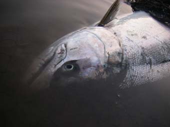 次の瞬間、藤松氏のロッドが『ガッ』と絞り込まれたものの、『銀色に輝く大きな魚体』は身を翻し消えていった。。。