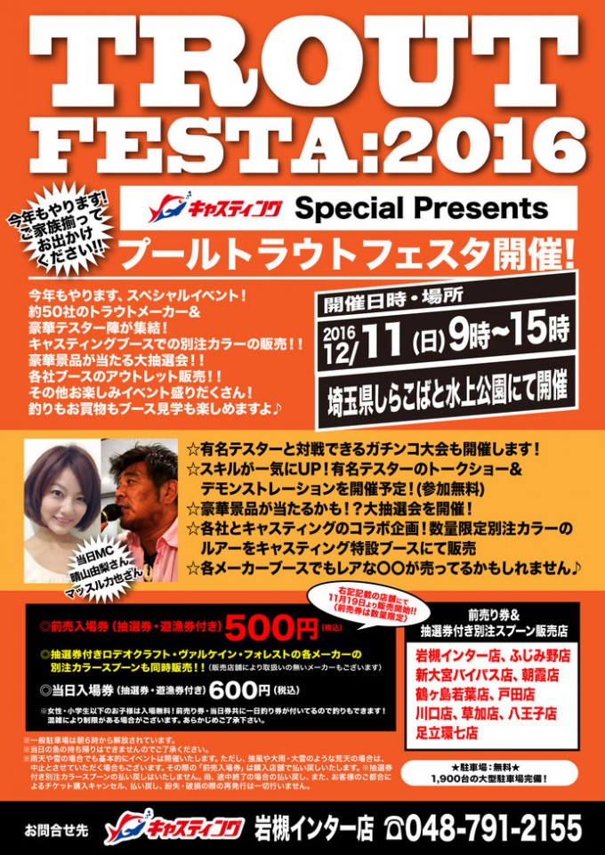 12月11日にしらこばとフィッシングフィールド様にて、TROUT FESTA2016が開催されます。