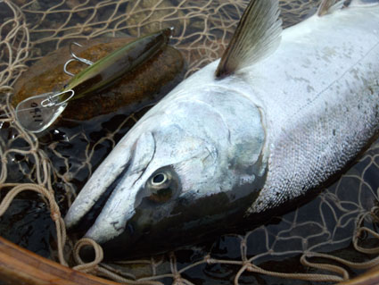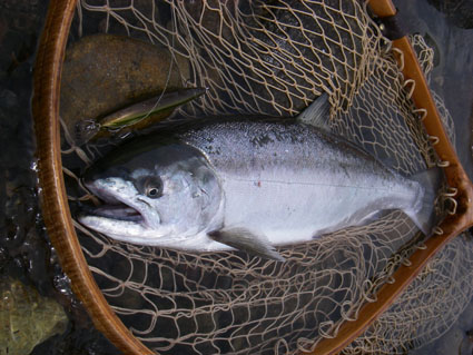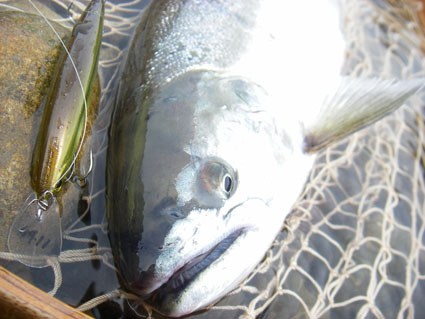 その流れは複雑で、三方から絞られた水が流れ込み、小さいけれど力強いヨレとなっているところへ、少し不安があったが0411を完全ダウンで放り込んだ。