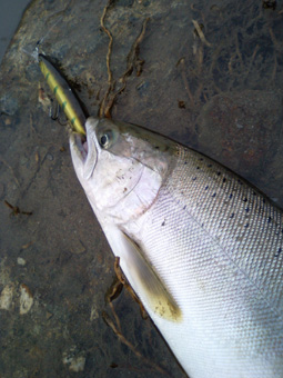 『グッ』と一気にリーリングを強めます! 『バシャ! バシャ!』 『グネッ! グネッ!』遠くの方で銀色の魚体が暴れ蠢いています。 しかしサイズがサイズであり、ハードなタックルを組んでいる為、サクラとのやり取りはあっさりと終了した。 |