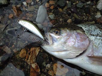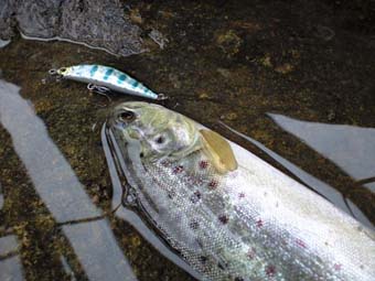 その後ルアーを『トリコロール55HW』にチェンジし、可愛いヤマメ達に遊んでもらいながら遡上を続け、格段に良い感じの流れ込みにキャストした途端に、『イワナ』とも『ヤマメ』とも違う爆発的かつ瞬発的な華麗なファイトが開始された!