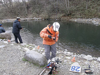 一回戦は一番下の6号池での釣りになりました。 B組みのクジを引いてA組の釣りが見れたので、いろいろ参考になりました。最初はティアロ1.6g派手ピンクで放流魚狙いでやりました。開始直後は、魚を手返しよく釣ろうと手前の魚からキャッチしていきます。 先日発売されたリリーサーを使い、手返しよく釣ることができました。放流直後は僕も相手の方もコンスタントに釣れていきます。 でも10分を過ぎたころから活性が落ちてきて、なかなか口をつかわなくなってきました。 そこで僕は魚が少し沈んだと判断して、ティアロ1.6gの自塗りカラー(茶赤)を一回底まで落としてゆっくり巻いてくることにしました。 そうしたら予想がずばり的中して、3本くらい立て続けにキャッチ。 |