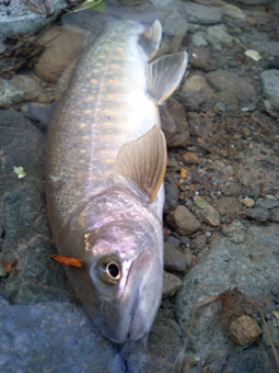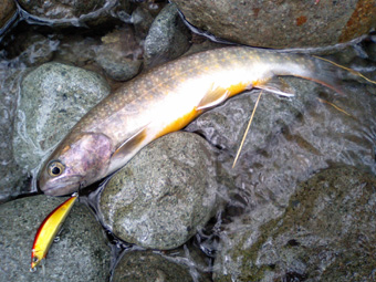 | 慎重に淵から魚を引きずり出し、瀬を流すように魚を足元まで引き寄せると、お腹にサビが残った立派なイワナでした。 | ![]() |
