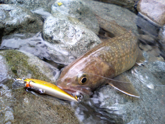 流れ込みの白く泡立った所を目掛け『トリコロール55S 赤金』を投入キャスト。 ルアーが沈み込んだ頃合を見計らいトィッチング開始。小さな淵のため数回のトィッチで瀬へルアーが差し掛かり、ルアーが瀬に飛び出るか出ないかのその瞬間に1匹目のイワナがバイト。(写真→) (1枚目の写真の後、イワナ君は見事に逃走いたしました。) |