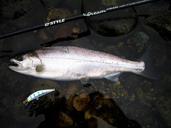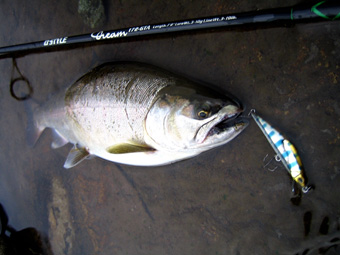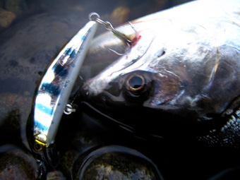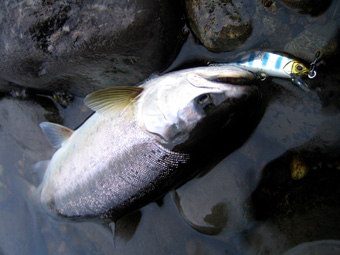 単純で早い。 だから、そのようにヤマメらしく単純に早く動かしてやる。 そうするとゴゴゴゴゴンとルアーの動きを止めるようなフッキングをする。 ひったくってる感じではなく、くわえ込んでいる感じだ。 口の中にフロントもテールも両方入っていることもある。(左写真参照) 今回もトリプルが2本とも口の中に入っていた。 季節によって、また種類によってベイトフィシュの動きも習性も違う。 そんなところもほじくってみると面白いかもしれない。 この銀ヤマメ、なかなかいい。 |