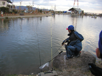 当日朝、開成に着いて池を一周してみると、見えている魚が予想よりはるかに大きいではありませんか!?フロロ1ポンドを巻いてきた私は、これを1ポンドで獲るのは無理と判断し、慌てて一緒に来ていた同モニターの杉山君に手伝ってもらい、1.5ポンドに巻き換えました。