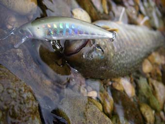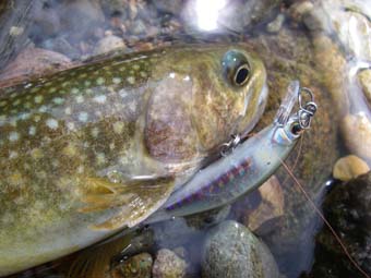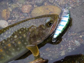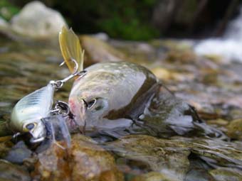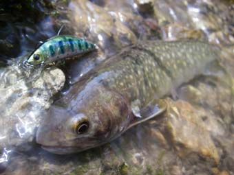 この『トリコロールHW』、今までの『トリコロールS』で攻め切れなかったチョッと深めの堰堤下で大活躍です!特に『ストライプワカアユ』!このルアーは逸品で『人には見やすく、魚にはスレにくい』と言う特性を持っているようで、小さな堰堤下から7匹のイワナを引き出した時には、そのポテンシャルにビックリしました。