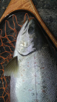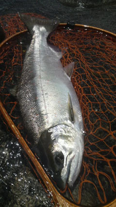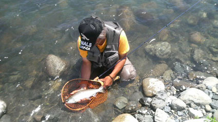 2012-07-09STEREAM FIELD STAFFルアー WRITER:JACKALL 終盤を迎えたサツキマス 7月4日 終盤を迎えたサツキマスですが揖斐川ではまだ狙えそうです。 友人のガイドで早朝から河に入りますが不発。 ダム水の影響からかウェーディングしていても足が痺れるくらいに冷たいです。 昼前には外気も30℃を越して真夏日。 トロ場から瀬に狙いを変えてゲストに釣り下ってもらいました。 後から撃ち始めたトリコロール67Sギンヤマメのウエイトチューンに良いサイズのサツキマスが猛追。 ターンする前にガツンときました。 41cm、見事な体高あるサツキマスでした PREV LIST NEXT
