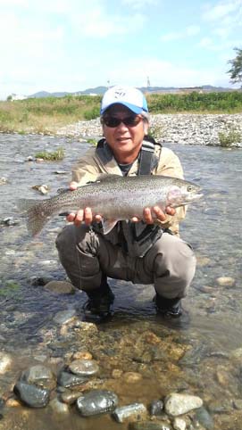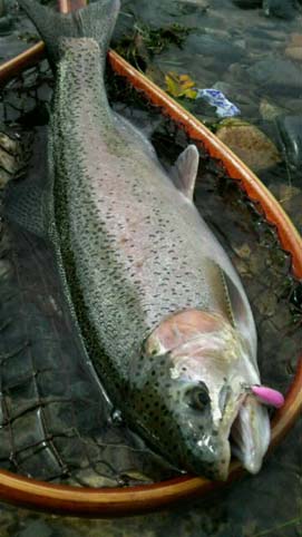 先ほどでもないけど、尾鰭が大きくレッドバンドの鮮やかな41cmのレインボーでした。