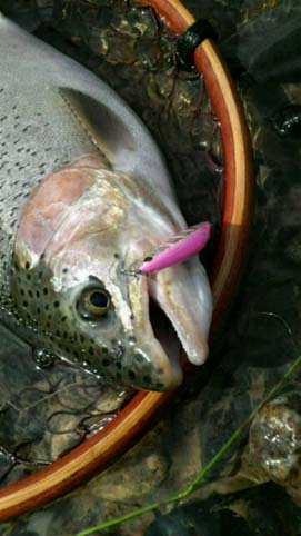 少し下流側にかなり水深のある同じような流れがあり、ちょっとミノーのアクションとカラーを変えてTIMONのトリコロール67HWピンクヤマメを対岸のテトラ際にキャスト。