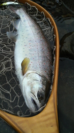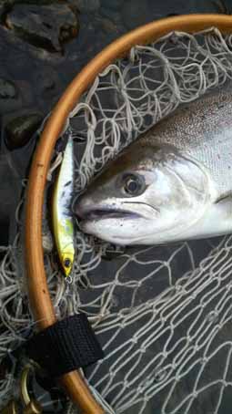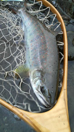 2011-06-22STEREAM FIELD STAFFルアー WRITER:JACKALL 6月21日 揖斐川上流にて 朝から小雨の降る中、終盤になりつつあるサツキマスを狙って出掛けました。前日の夕方に惜しくもネットイン寸前で型の良いサツキをバラしたポイントに入ってみました。 ガンガン瀬から平瀬に変わる辺りからダウンクロスでトリコロール67HWストライプアユを浮かされないように流し込んでいくと、数投目で食ってきました。 サツキマスではありませんが本流育ちの筋肉質なアマゴ、33センチでした。 PREV LIST NEXT