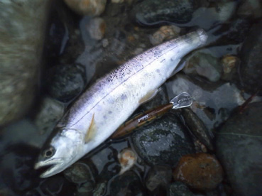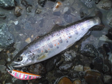 もう散々攻められたあとだろう、と諦め半分でしたが、トリコロール47HW、視認性と濁りの中でのアピールを考え新色のピンクヤマメを選びクロスにキャスト。 緩流帯に沈んでいる岩にさしかかった所で平打ちさせてやると、アマゴがヒットしました。 |